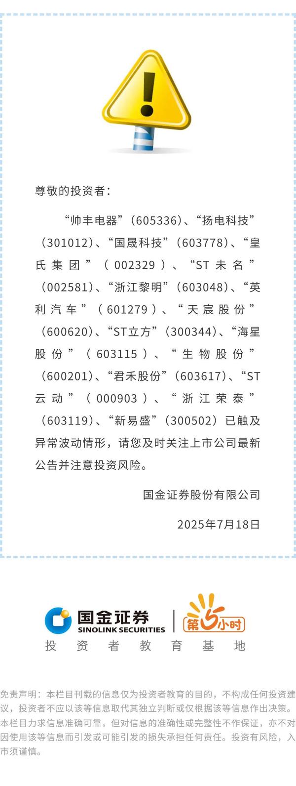 关于“帅丰电器”、“扬电科技”等证券交易异常波动的风险提示