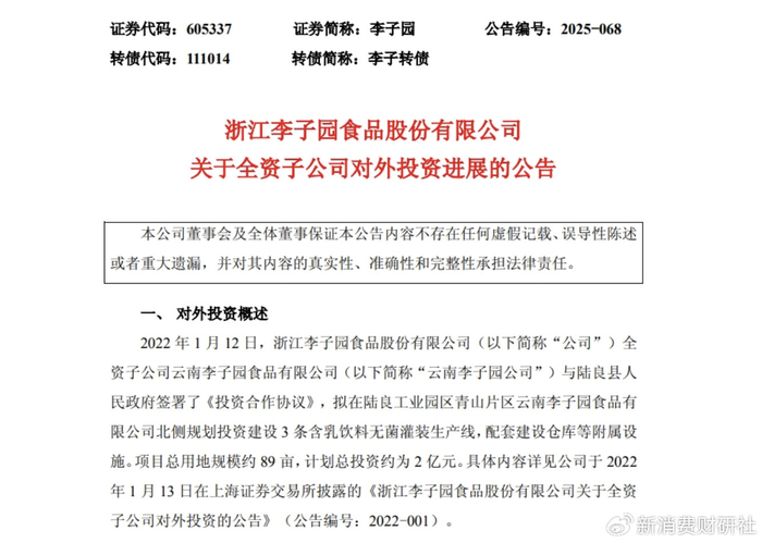 近日,以甜牛奶为主业的李子园(605337.SH)发布公告,宣布终止云南子公司2亿元含乳饮料二期项目。这一原本计划建设3条无菌灌装产线的投资,因“土地规划、产业规划等客观因素”搁浅。