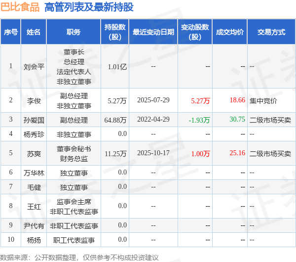巴比食品近半年内的董监高及核心技术人员增减持详情如下: