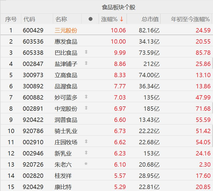A股异动丨食品饮料股走强,三元股份、惠发食品、巴比食品涨停