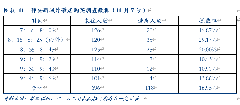 静安新城店:位于闵行区龙茗路,近地铁站且地处小区中心,周边有学校及同类竞品,11月上旬由传统老店改造而来,新增小笼包产品。门店为单一铺面,无堂食座位,产品SKU较堂食店精简,小笼包设5个SKU且标价较堂食店低1元,早高峰配备8名员工负责制作与出餐。经抽样估算,11月7日门店在活动及下雨影响下,估算当天营业额约6500-7000元,较上海区域门店平均日销翻倍。