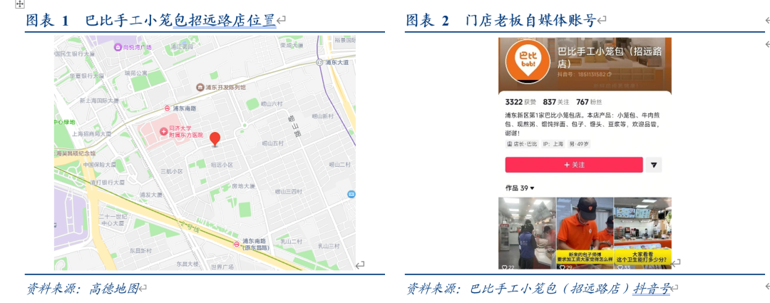 新店经营情况:近期我们线下走访上海地区两个“巴比小笼包”新店型,以下是相关反馈:
