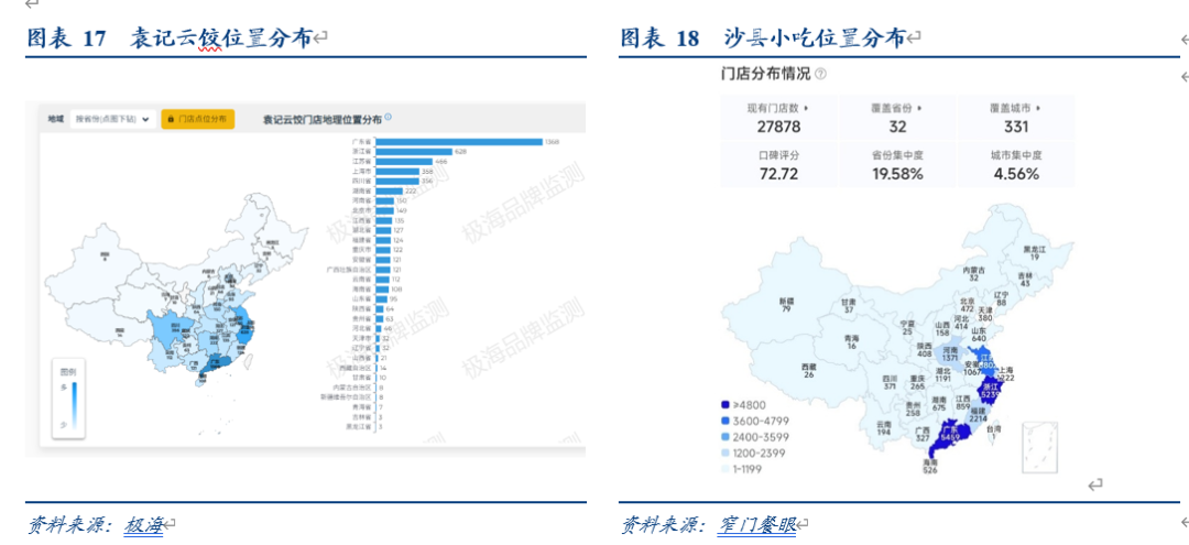 二是对比其他品牌来看:首先对比沙县小吃,巴比定位类似,都属于性价比的居民社区小吃,具备一定地域属性,在江浙沪可以进行对标,而在江浙沪,沙县小吃数量已破万家,因此值得乐观看待巴比小笼包开店空间上限。其次,对比袁记云饺来看,产品定位都是小吃,客户群体都是中老年人居多,开店位置也都是社区为主,同时聘请员工人数接近,客单价上袁记20元高于巴比12元,且都主打手工包制+馅料配送,但目前巴比店效更优,初始投入更低,回本周期更短,具备更强吸引力,极海数据显示目前袁记云饺全国5000+家,江浙沪区域接近1500家,我们认为若运营到位,未来巴比在江浙沪空间可对标该数目。