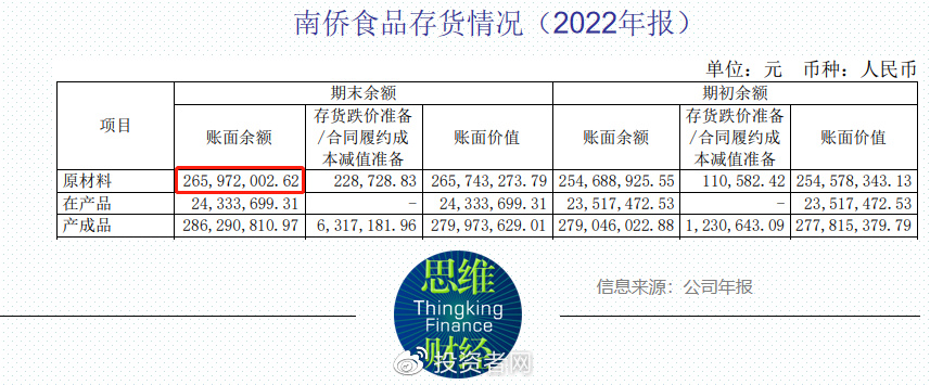从年报数据来看,南侨食品2022年底原材料账面余额2.66亿元,计提了22.9万元的存货跌价准备。