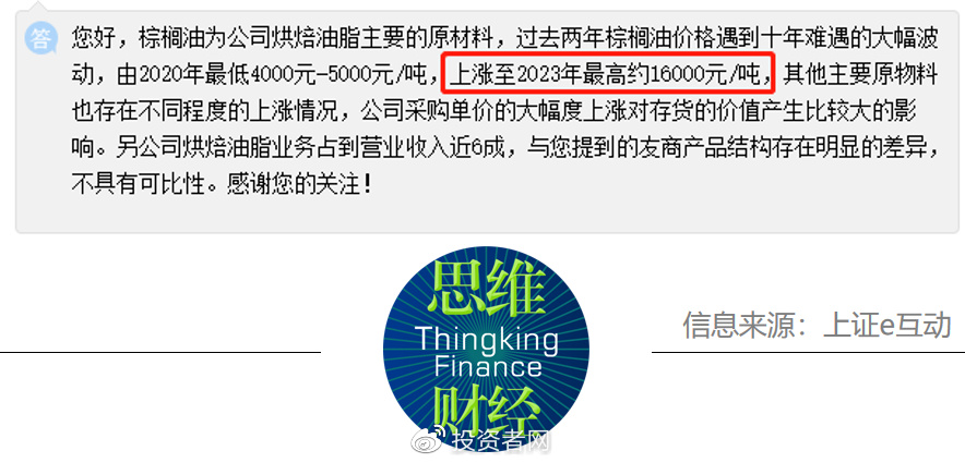 不仅如此,棕榈油价格也加大了公司产成品的价格风险。