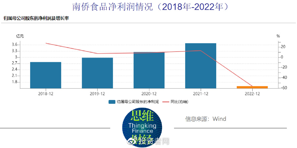 据年报披露,2022年南侨食品实现营收 29 亿元,同比下滑0.4%。同期,公司净利润为1.6亿元,同比下滑56%,是近年来公司盈利最少的一年。