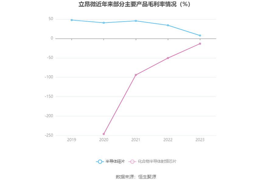 分产品看,半导体硅片、半导体功率器件芯片、化合物半导体射频芯片2023年毛利率分别为7.72%、41.23%、-13.25%。