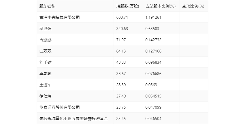 年报显示,2023年年末公司十大流通股东中,新进股东为吉娜娜、刘千瑜、王进军、徐仕炜、华泰证券股份有限公司、景顺长城量化小盘股票型证券投资基金,取代了三季度末的中国国际金融香港资产管理有限公司-CICCFT10(R)、海南康运能源科技有限公司、吉红萍、中国国际金融股份有限公司、中信里昂资产管理有限公司-客户资金-人民币资金汇入、国泰君安证券股份有限公司。在具体持股比例上,香港中央结算有限公司、卓乌笔持股有所上升,吴世强、白双双持股有所下降。