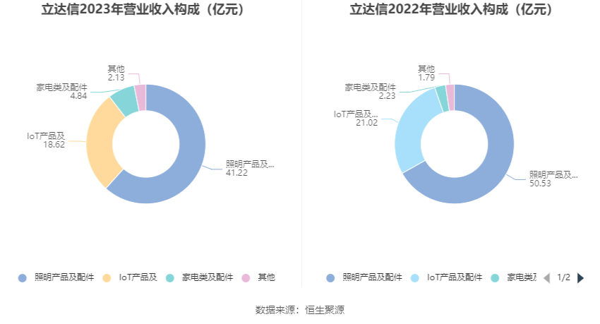 分产品来看,2023年公司主营业务中,照明产品及配件收入41.22亿元,同比下降18.42%,占营业收入的61.70%;IoT产品及收入18.62亿元,占营业收入的27.86%;家电类及配件收入4.84亿元,同比增长116.87%,占营业收入的7.24%。
