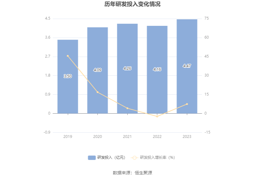 2023年全年,公司研发投入金额为4.47亿元,同比增长7.45%;研发投入占营业收入比例为6.69%,相比上年同期上升1.18个百分点。此外,公司全年研发投入资本化率为0。