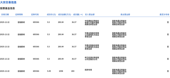 12月22日,宏柏新材大宗交易成交345.48万股,成交额1898.16万元,占当日总成交额的25.37%,成交均价5.49元,较市场收盘价6.07元折价9.48%,其中最高成交价5.5元,最低成交价5.49元。