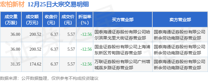 12月25日宏柏新材现3笔折价12.56%的大宗交易 合计成交575.66万元