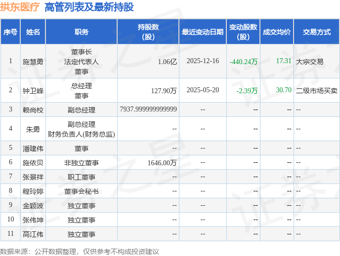 拱东医疗的高管列表及最新持股情况如下: