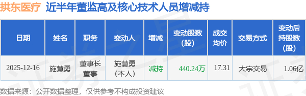 拱东医疗:12月16日高管施慧勇减持股份合计440.24万股