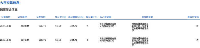 10月28日,博迁新材大宗交易成交8万股,成交额409.44万元,占当日总成交额的0.97%,成交价51.18元,较市场收盘价56.15元折价8.85%。