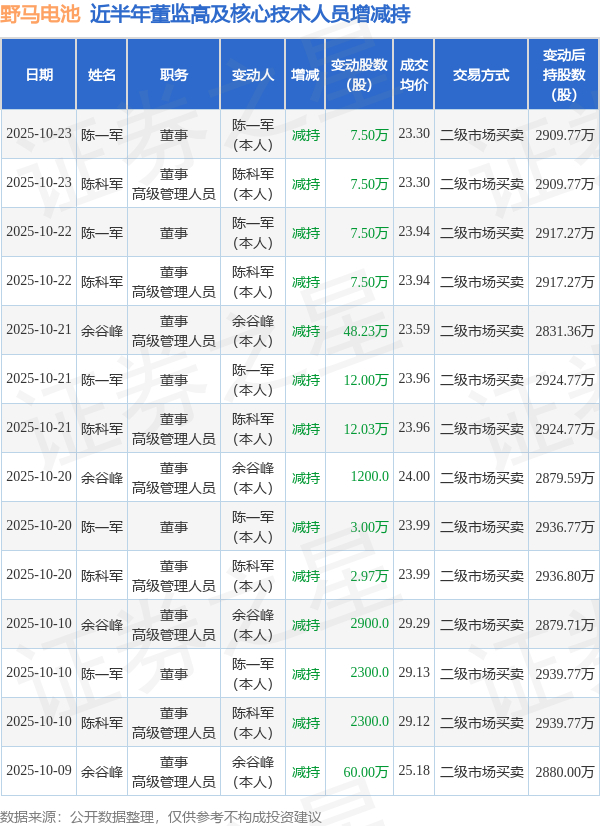 野马电池:10月22日至10月23日高管陈一军、陈科军减持股份合计30万股