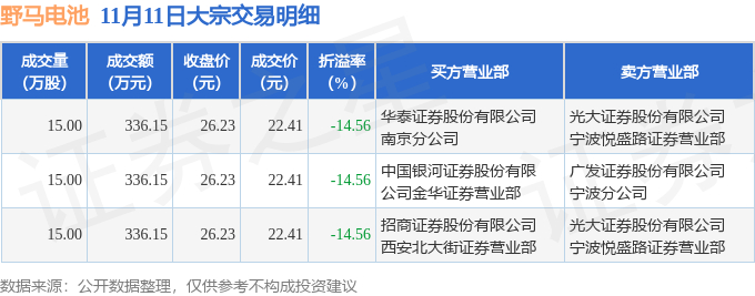 11月11日野马电池现3笔折价14.56%的大宗交易 合计成交1008.45万元