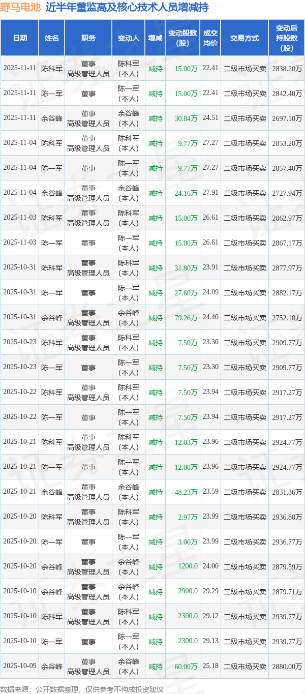 野马电池近半年内的董监高及核心技术人员增减持详情如下: