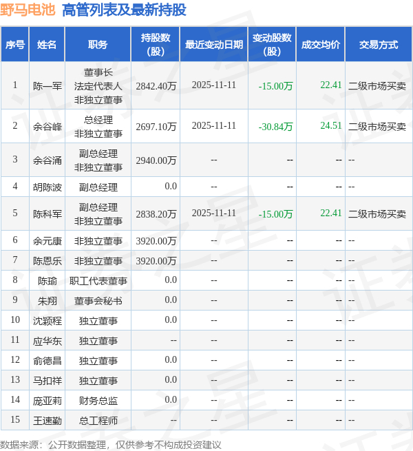 野马电池的高管列表及最新持股情况如下:
