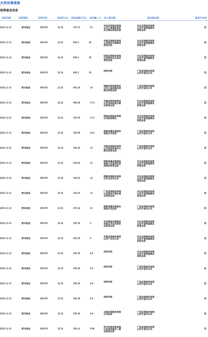 11月13日,野马电池大宗交易成交283.19万股,成交额6374.62万元,占当日总成交额的12.85%,成交价22.51元,较市场收盘价27.51元折价18.18%。
