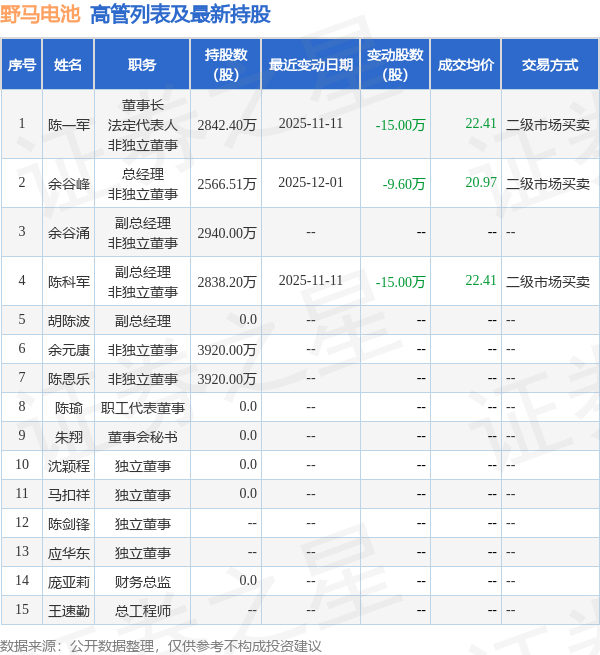 野马电池近半年内的董监高及核心技术人员增减持详情如下:
