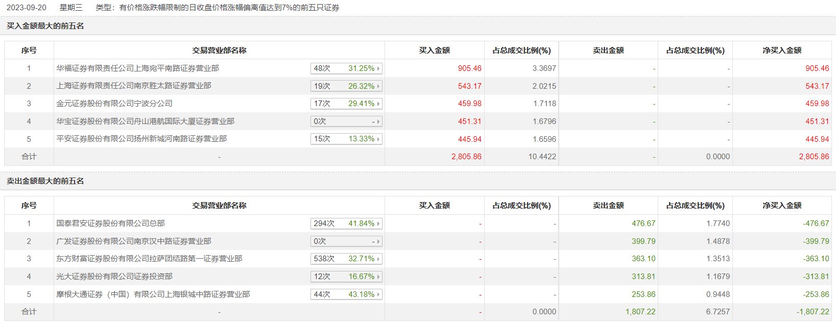 具体来看,华福证券上海宛平南路证券营业部、上海证券南京胜太路证券营业部分别买入905.46万元、543.17万元;国泰君安证券总部、广发证券南京汉中路证券营业部分别卖出476.67万元、399.79万元。