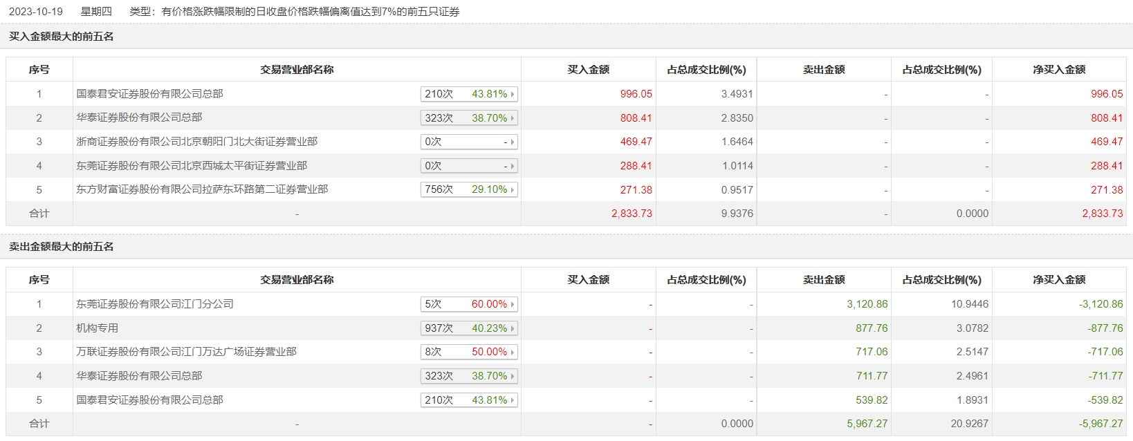 其中,机构合计净卖出877.76万元。此外,东莞证券江门分公司、万联证券江门万达广场证券营业部分别卖出3120.86万元、717.06万元;国泰君安证券总部、华泰证券总部分别买入996.05万元、808.41万元。