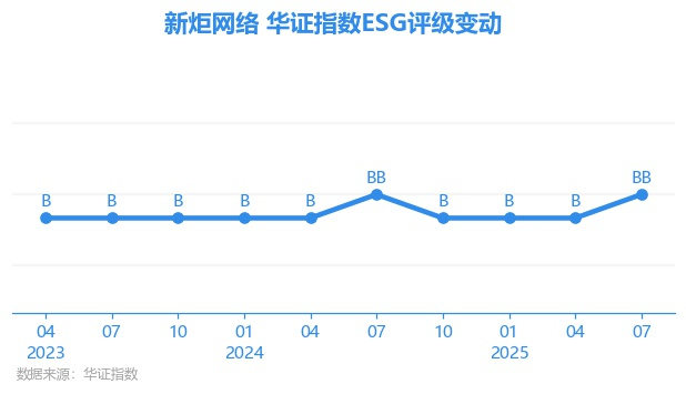 日前,华证指数公布了新一期(2025年7月31日)的ESG评级结果,新炬网络(605398.SH)获得BB评级(华证指数评级为C起至AAA九档,C为最低档,AAA为其最高一级评级/AA为其第二档),上一期(2025年4月30日)ESG评级为B。本期ESG评级在156家软件行业A股上市公司中排名第73(上一期排名第68)。