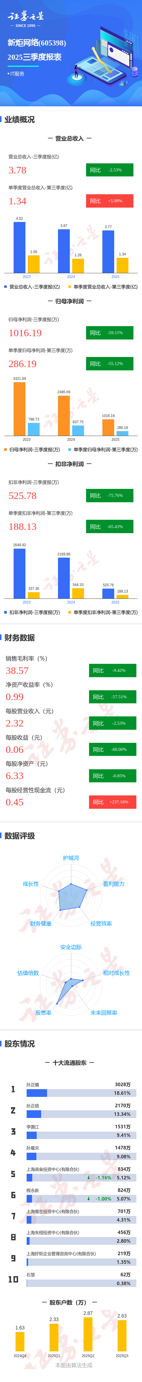 证券之星消息,新炬网络2025年三季报显示,公司主营收入3.78亿元,同比下降2.54%;归母净利润1016.19万元,同比下降59.12%;扣非净利润525.78万元,同比下降75.77%;其中2025年第三季度,公司单季度主营收入1.34亿元,同比上升5.99%;单季度归母净利润286.19万元,同比下降55.13%;单季度扣非净利润188.13万元,同比下降65.44%;负债率11.12%,投资收益117.41万元,财务费用-345.36万元,毛利率38.57%。