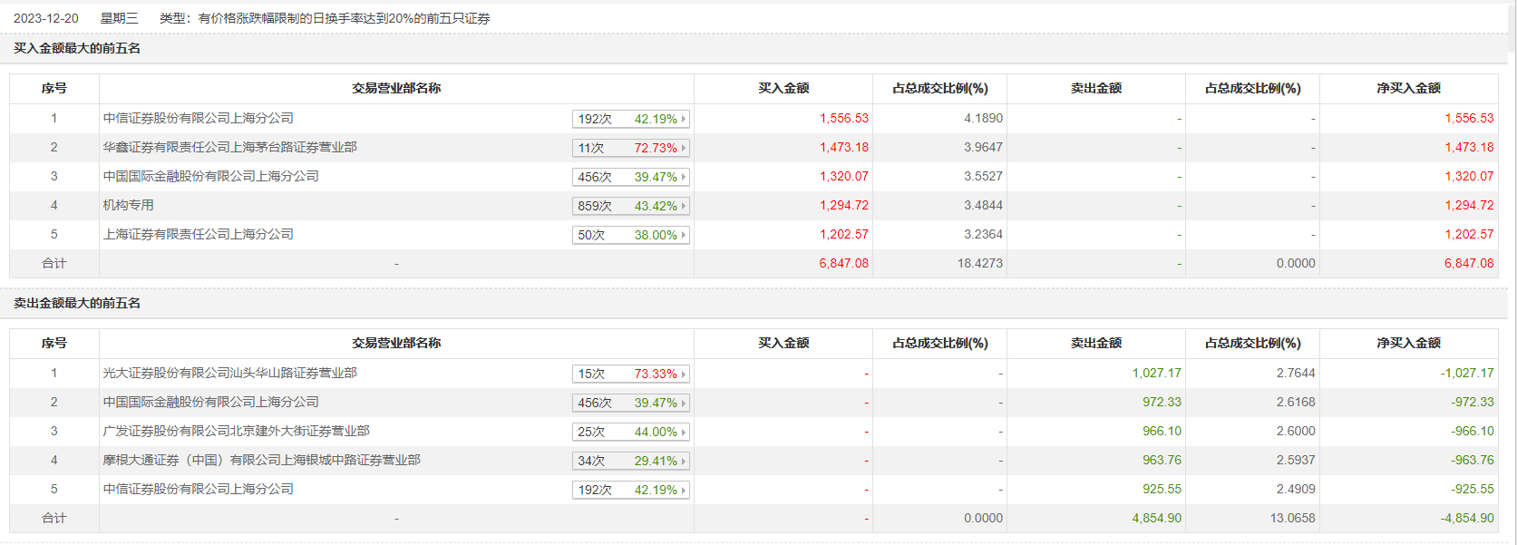 具体来看,机构合计净买入1294.72万元。此外,知名游资现身龙虎榜,光大证券(维权)汕头华山路证券营业部、中国国际金融上海分公司分别卖出1027.17万元、972.33万元;中信证券上海分公司、炒股养家(华鑫证券上海茅台路证券营业部)分别买入1556.53万元、1473.18万元。
