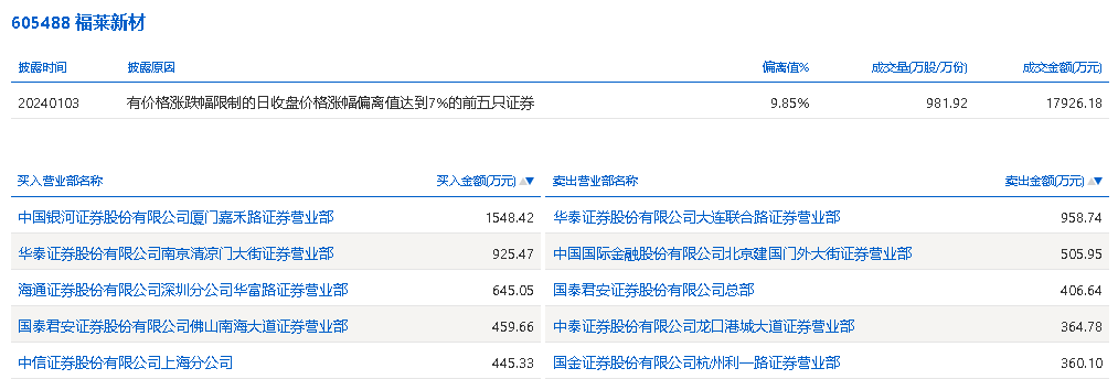 1月3日,福莱新材今日涨停,全天换手率达18.87%,振幅达9.25%。龙虎榜数据显示,营业部席位合计净买入1427.71万元。其中,中国银河证券厦门嘉禾路证券营业部、华泰证券南京清凉门大街证券营业部分别买入1548.42万元、925.47万元;华泰证券大连联合路证券营业部、中国国际金融北京建国门外大街证券营业部分别卖出958.74万元、505.95万元。