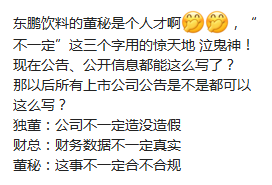 但这番表述引来网友吐槽:“东鹏饮料的董秘是个人才啊,'不一定'这三个字用的惊天地 泣鬼神!现在公告、公开信息都能这么写了?那以后所有上市公司公告是不是都可以这么写?