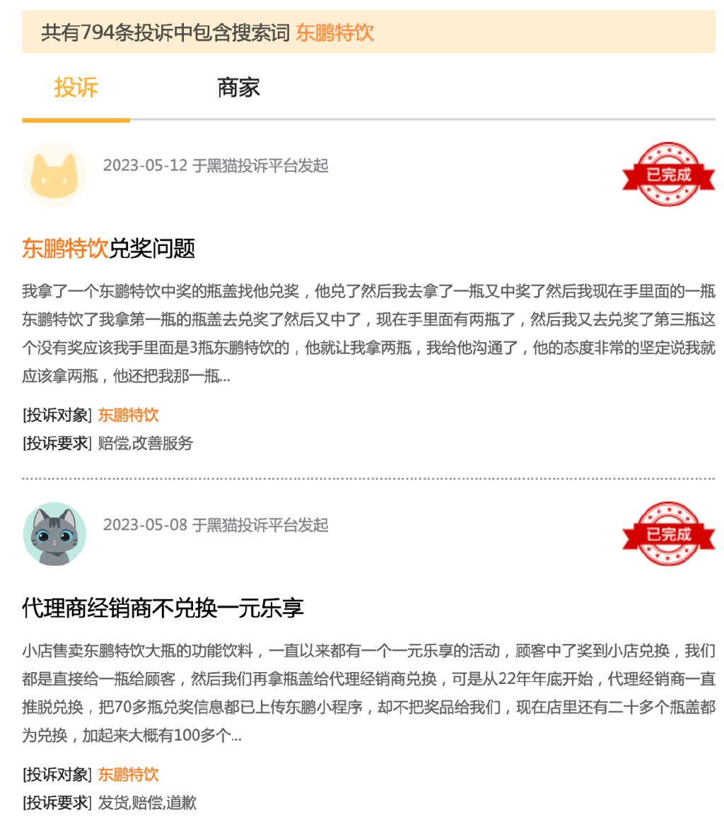 除新品表现欠佳外,作为东鹏特饮抢占市场重要营销手段的瓶盖兑奖与一元换购活动,也屡遭消费者投诉。黑猫投诉[投诉入口]平台上,与“东鹏特饮”有关投诉高达794条,内容多为消费者购买东鹏特饮中奖后无法兑奖。