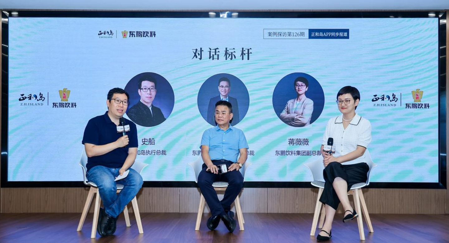 进入“对话标杆”环节,正和岛执行总裁史船与东鹏饮料集团董事长林木勤、东鹏饮料集团副总裁蒋薇薇进一步就企业发展的关键战略决策、商业模式、核心竞争力等展开深入探讨。