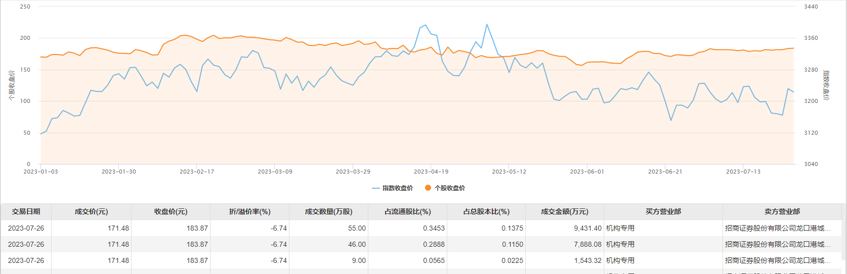 今日大宗交易成交110万股,成交额1.89亿元,占当日总成交额的67.5%,成交价171.48元,较市场收盘价183.87元折价6.74%。