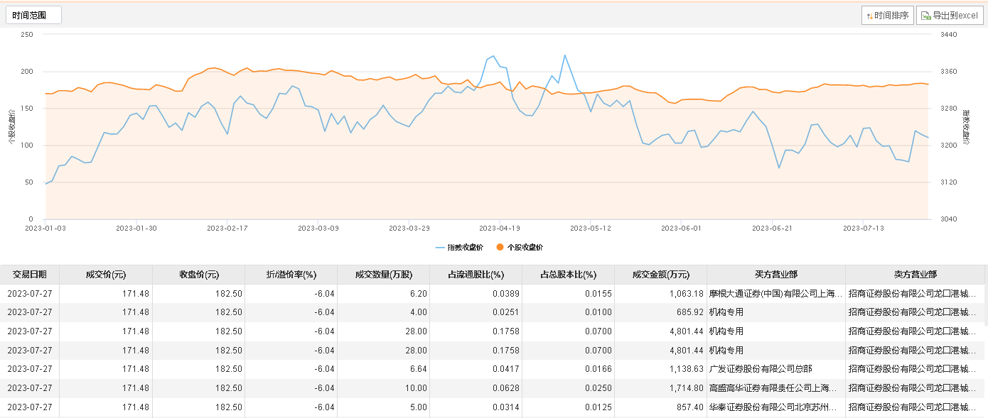 7月27日大宗交易成交87.84万股,成交额1.51亿元,占当日总成交额的55.48%,成交价171.48元,较市场收盘价182.5元折价6.04%。