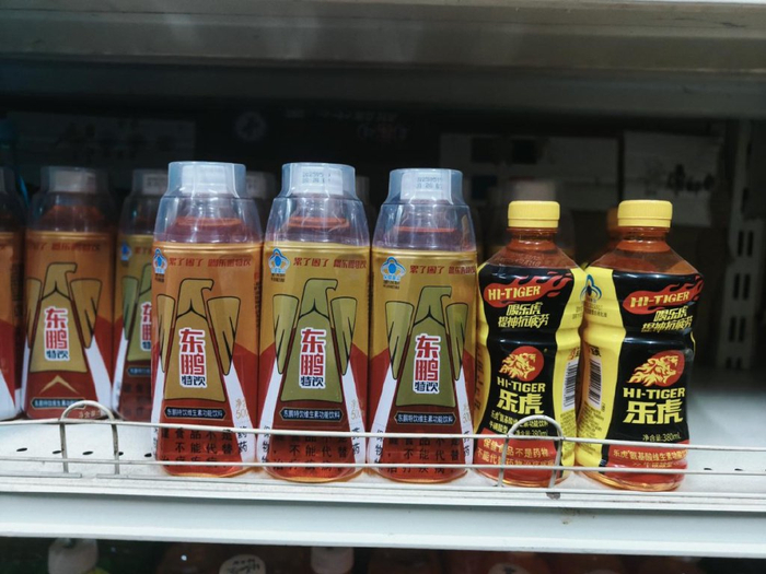 「市象」还在旁边的网吧、火锅店、烧烤店以及一些小副食店发现,即便这些类型的门店没有大型卖场、商场或者便利店的标准化陈列柜台,但依然有红牛、体质能量等品类,东鹏特饮则略有不足,个别店甚至长期会空缺。