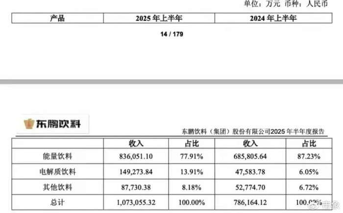 放大来看,据公开财报资料,2025年上半年,以东鹏特饮为主的能量饮料收入约83.60亿元,占总营收的77.91%,上年同期占比为87.23%,1-9月合计下降为74.63%;“东鹏补水啦”年中收入为14.93亿元,同比增长213.7%,占总收入的比重达到13.9%,1-9月合计提升至本年16.91%;其他诸如东鹏大咖、茉莉茶饮等品类合计占比在年中和前三季度均不足10%。