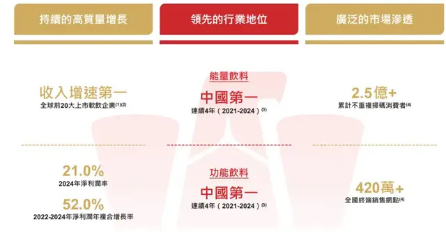 截至2025年6月30日,东鹏饮料的立体化销售网络覆盖全国逾420万家终端销售网点,实现中国近100%地级市覆盖,已与逾2.5亿消费者建立连接,并与逾3200个经销伙伴深度合作,成功构筑起经营护城河。
