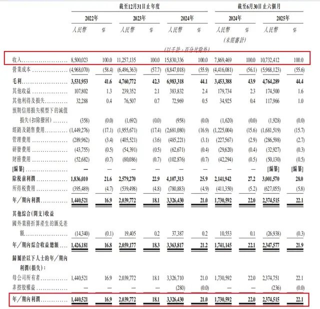 作为国内功能饮料行业的龙头企业,东鹏饮料近年来业绩表现亮眼。《招股说明书》显示,2022年至2025年6月底(以下简称“报告期”),公司整体的营收分别为85.00亿元、112.57亿元、158.30亿元和107.32亿元,对应的净利润分别为14.41亿元、20.40亿元、33.26亿元和23.75亿元。2024年营收与净利润同比增速分别达到40.63%和63.09%,展现出强劲的增长势头。