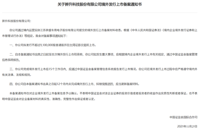 骅升科技于11月25日通过备案,拟发行不超过9,100,000股普通股并在台湾证券交易所上市。