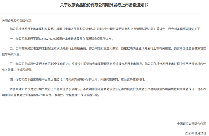 牧原股份于11月25日通过备案,拟发行不超过546,276,700股境外上市普通股并在香港联合交易所上市。公司备案耗时168天。