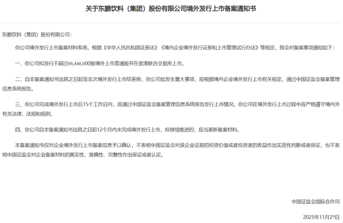 东鹏饮料于11月27日通过备案,拟发行不超过66,446,000股境外上市普通股并在香港联合交易所上市。公司备案耗时230天。