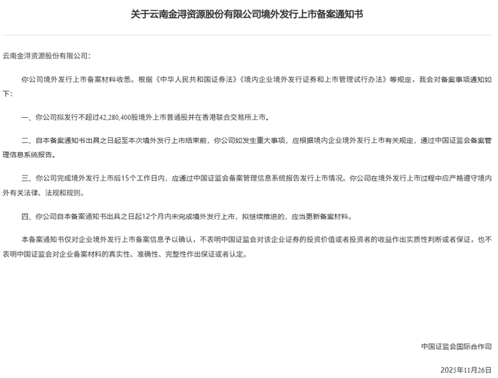 金浔资源于11月26日通过备案,拟发行不超过42,280,400股境外上市普通股并在香港联合交易所上市。公司备案耗时159天。