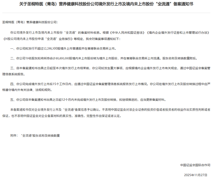 圣桐特医于11月27日通过备案,拟发行不超过12,298,300股境外上市普通股并在香港联合交易所上市。公司19名股东拟将所持合计60,600,000股境内未上市股份转为境外上市股份,并在香港联合交易所上市流通。公司备案耗时163天。