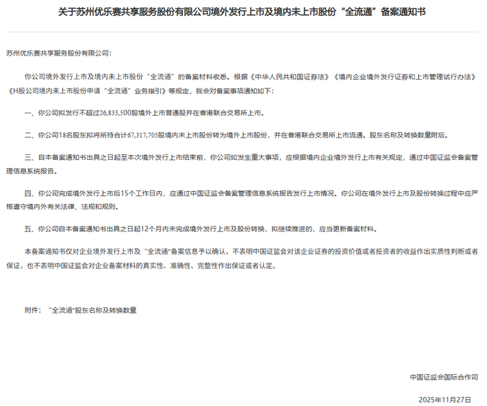 优乐赛于11月27日通过备案,拟发行不超过26,833,500股境外上市普通股并在香港联合交易所上市。公司18名股东拟将所持合计67,317,705股境内未上市股份转为境外上市股份,并在香港联合交易所上市流通。公司备案耗时364天。