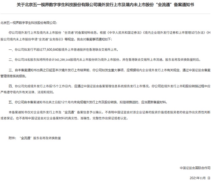 五一视界通过备案,拟发行不超过77,600,840股境外上市普通股并在香港联合交易所上市。公司38名股东拟将所持合计363,299,144股境内未上市股份转为境外上市股份,并在香港联合交易所上市流通。公司备案耗时351天。