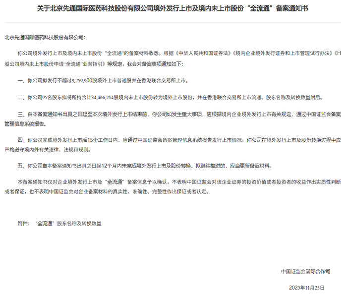 先通医药于11月25日通过备案,拟发行不超过9,259,900股境外上市普通股并在香港联合交易所上市。公司95名股东拟将所持合计34,466,214股境内未上市股份转为境外上市股份,并在香港联合交易所上市流通。公司备案耗时169天。