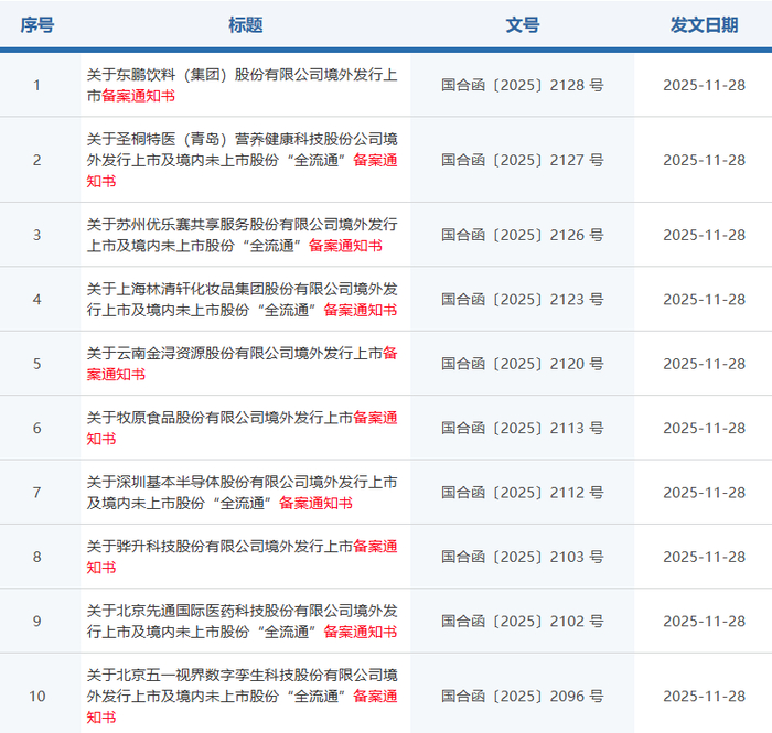 11月28日,中国证监会网站披露信息显示,新增10家企业获境外发行上市或境内未上市股份“全流通”备案通知书。