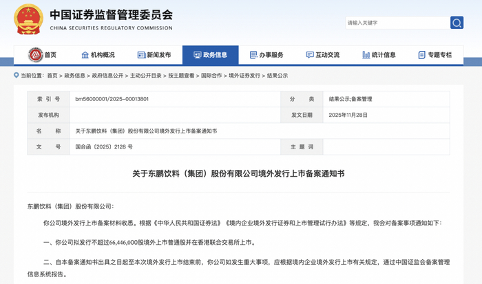 根据备案通知书,东鹏饮料拟发行不超过6644.6万股境外上市普通股并在香港联合交易所上市。
